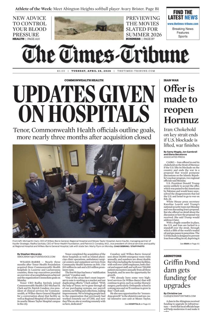 WILKES-BARRE — Nearly three months after Tenor Health Foundation acquired three Commonwealth Health hospitals in Luzerne and Lackawanna counties, three top executives provided an overview of accomplishments achieved and the organization’s immediate goals on Monday. Tenor CEO Radha Savitala joined Commonwealth Health CEO Michael B. Clark and Dr. Patrick Conaboy, vice president of clinical services for Commonwealth, at Wilkes-Barre General Hospital for a conversation about that facility as well as Regional Hospital of Scranton and its nearby Moses Taylor Hospital campus in the city. Tenor completed the acquisition of the three hospitals as well as related physician clinic operations, ambulatory surgical centers and outpatient services from Community Health Systems on Feb. 1 for $33 million in cash and a $15 million promissory note. The first 90 days has been a “stabilization period,” Conaboy said. “One of the areas that’s most important to note is working as a market and not duplicating efforts,” Clark added. “With the help of Tenor, we’ve gone through all of our purchasing systems, our payroll systems, our billing and collections, making improvements. We’re bringing people back to the organization that previously had worked remotely out of CHS, and now they’ll be on-site or working remotely with us here, dedicated.” Conaboy said Wilkes-Barre General sees about 30,000 emergency room visits annually, and numbers are about double that when including the Scranton facilities, with well over 3,000 employees, both clinical and support staff, and well over 700,000 patient encounters annually from all three hospitals, and he sees the opportunity for growth. “We already have some very high-level services (in Wilkes-Barre) that will continue to grow, such as cardiac thoracic surgery, particularly. Orthopedic school is a strong area and we’ll continue to grow in that,” Clark said. He also sees opportunities for “tremendous growth” in the obstetrics and neo-natal intensive care unit at Moses Taylor, which he said is the only such provider in the area."